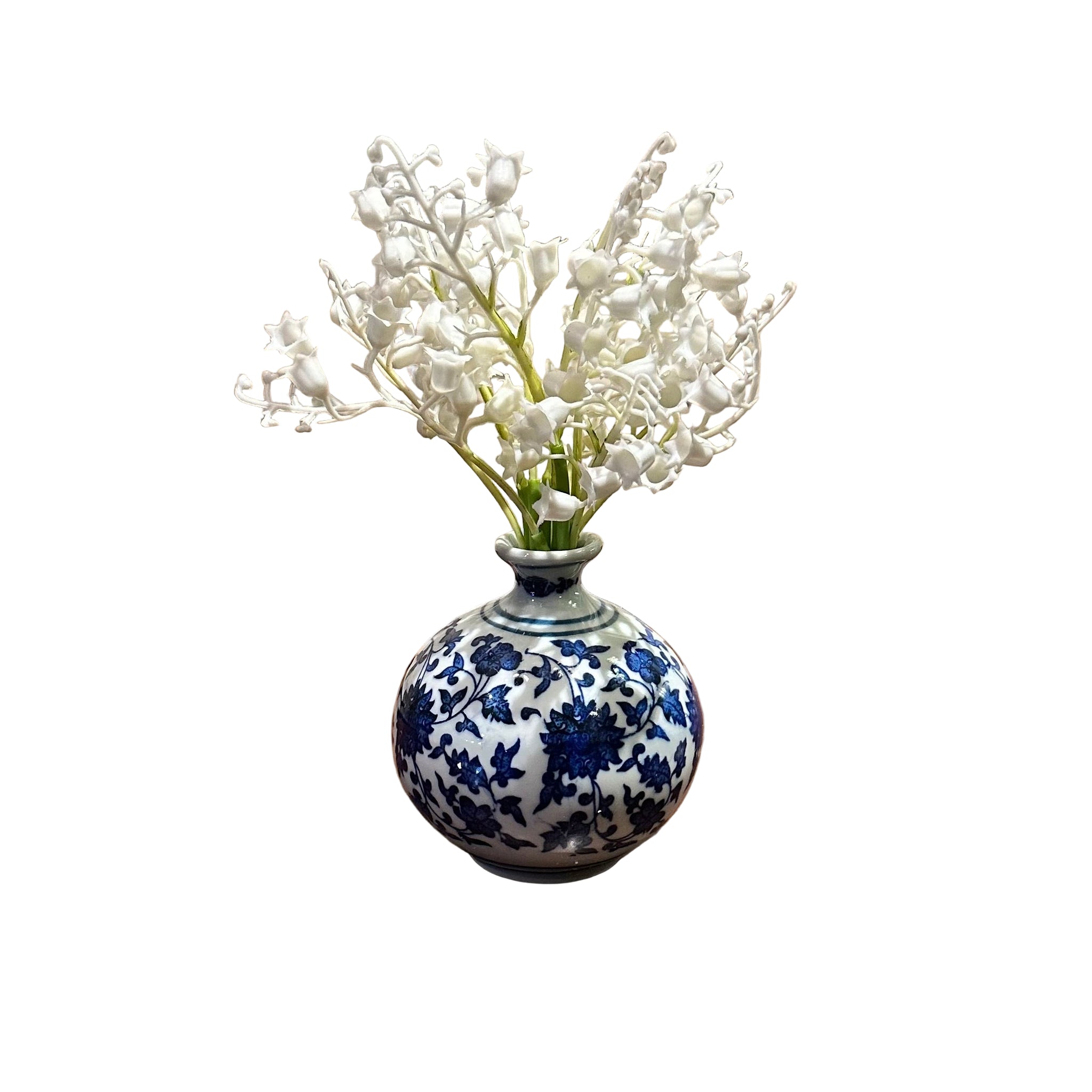 Stunningly beautiful, this 7" silk Lily of the Valley flower arrangement with blue and white vase is perfect for both home and office, and makes a thoughtful gift too. Handcrafted with high quality artificial flowers, each petal is meticulously placed for a lifelike appearance. This faux flower arrangement is ready to be displayed and will never require maintenance or water.