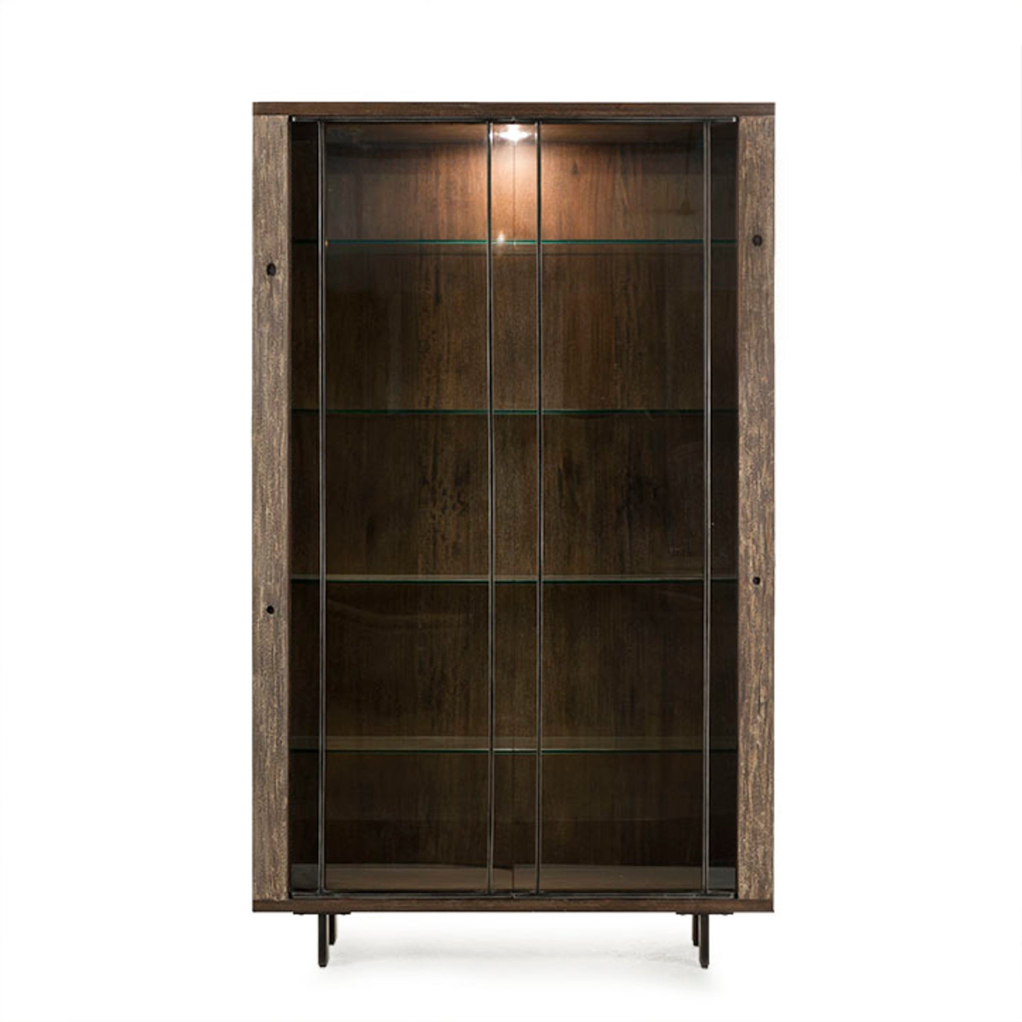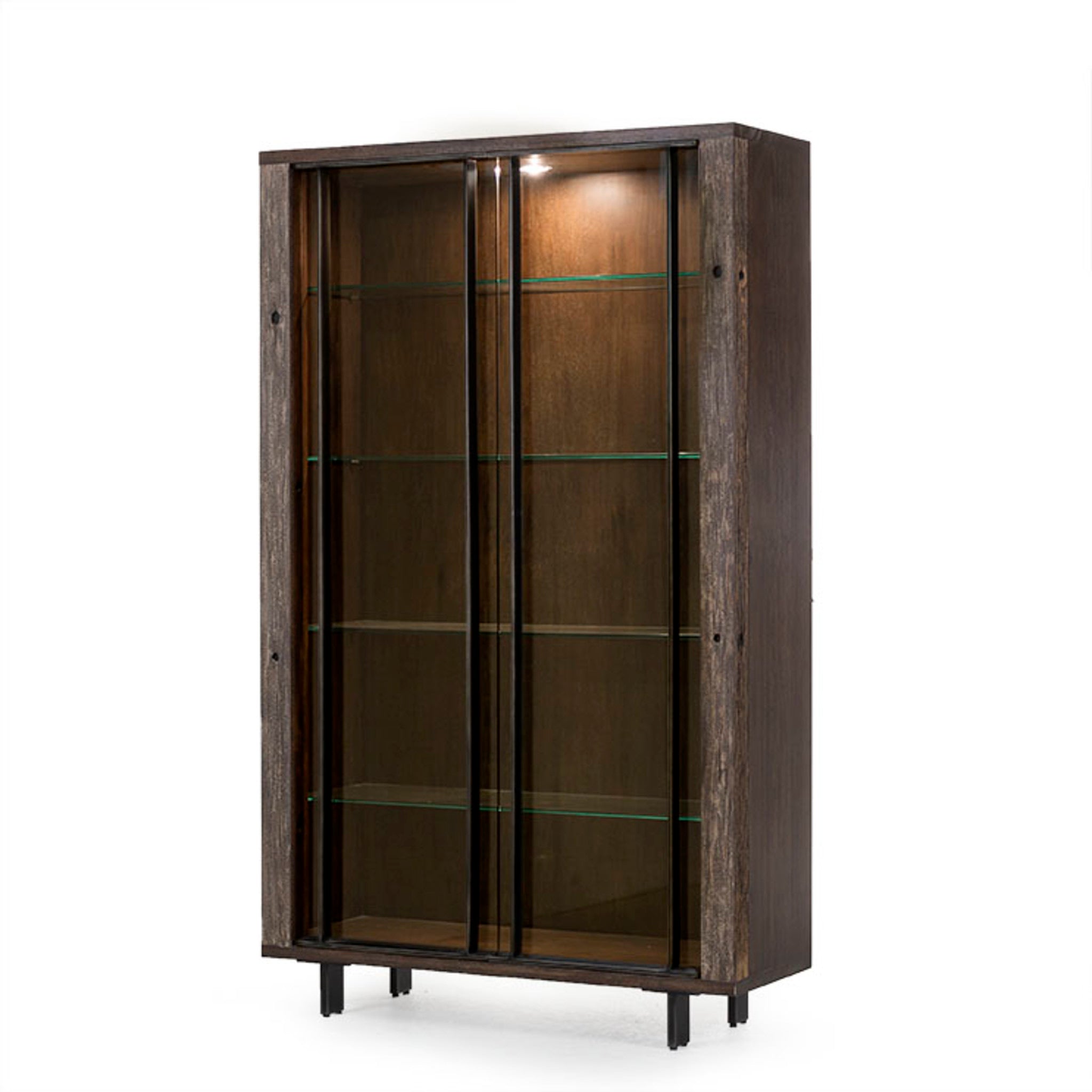 Style is found in this handsome Bookcase the reclaimed cruzeta timber, with tempered glass doors and shelves and iron legs, gives it a contemporary feel, built-in LED lighting will be focal point in any space.